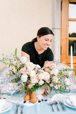 Step 4: Lastly, place water picks on each bloom and insert them into the design. For stems like delphinium and carnations, water tubes weren’t necessary given it was a cool, fall day, and the arbor was inside. Remember, adding water picks to each bloom takes time. Plan ahead!